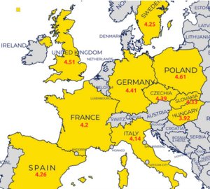 Los datos reflejan que Polonia (4,6), Reino Unido (4,5) y Alemania (4,4) lideran la clasificación, mientras que Eslovaquia (4,3), Suecia (4,2), España (4,2) y Francia (4,2) ocupan posiciones intermedias. En el lado opuesto, Italia (4,1) y Hungría (3,9) presentan una mayor vulnerabilidad financiera.