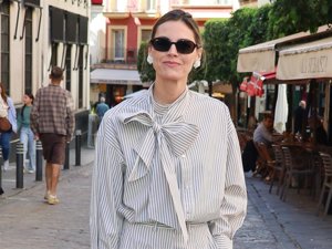 No ha podido empezar mejor la Semana Santa, siguiendo la tradición pies juntillas, estrenando el Domingo de Ramos década y, según el refranero, outfit. Amaia Salamanca no ha defraudado, cada año ocupa las primeras posiciones del ranking de las más elegantes de las mujeres que pasean palmito por Sevilla en esta época del año y este 2026 lo ha hecho con un dos piezas de rayas formado por pantalón y blusa con lazada al cuello que ha combinado con zapatos blancos, bolso coral y pendientes de nácar. La actriz ha recogido su melena rubia en un moño bajo y, cual diva del séptimo arte, no se ha quitado sus gafas de sol, aprovechando el sol reinante en la ciudad del Guadalquivir.